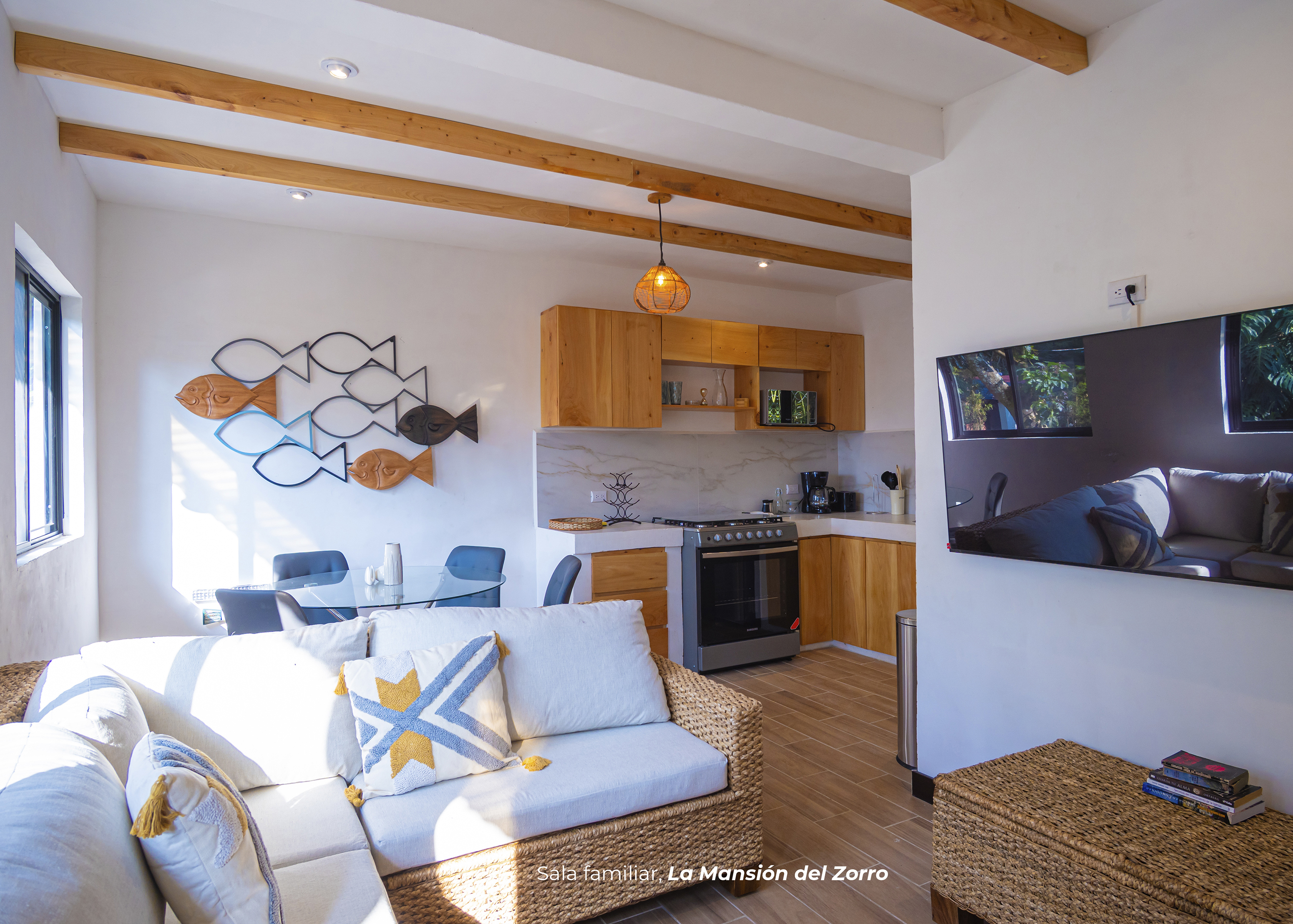 Cuentas con una habitación que tiene dos camas king y dos camas imperiales adicionales, 1 baño con regadera, sala con televisor, comedor y cocina equipada.