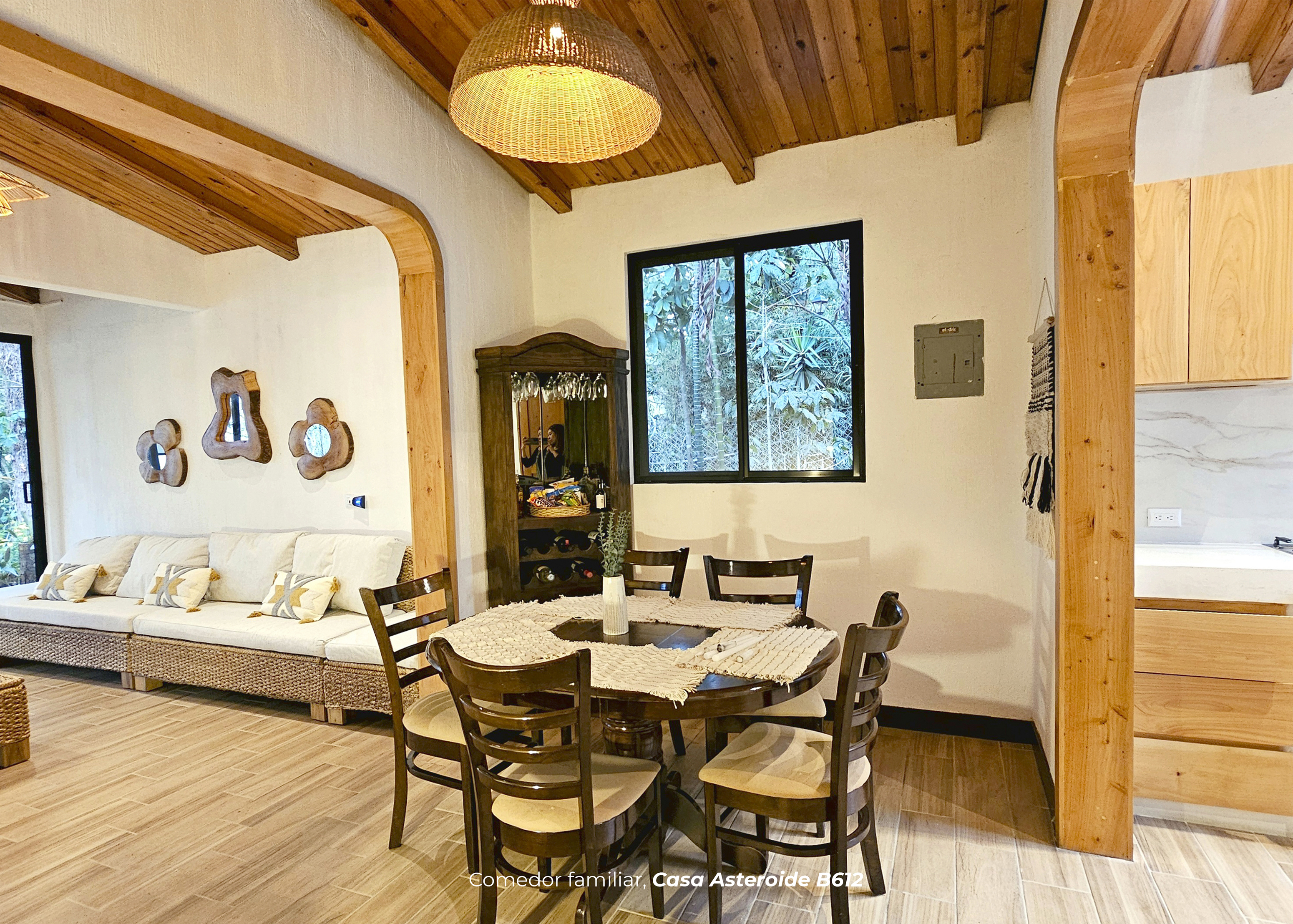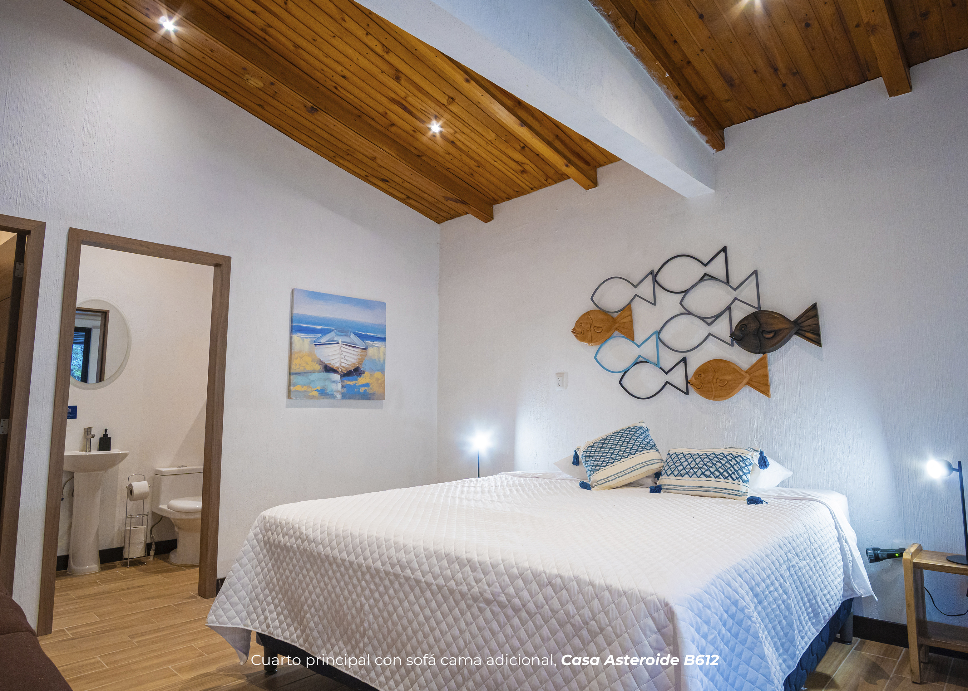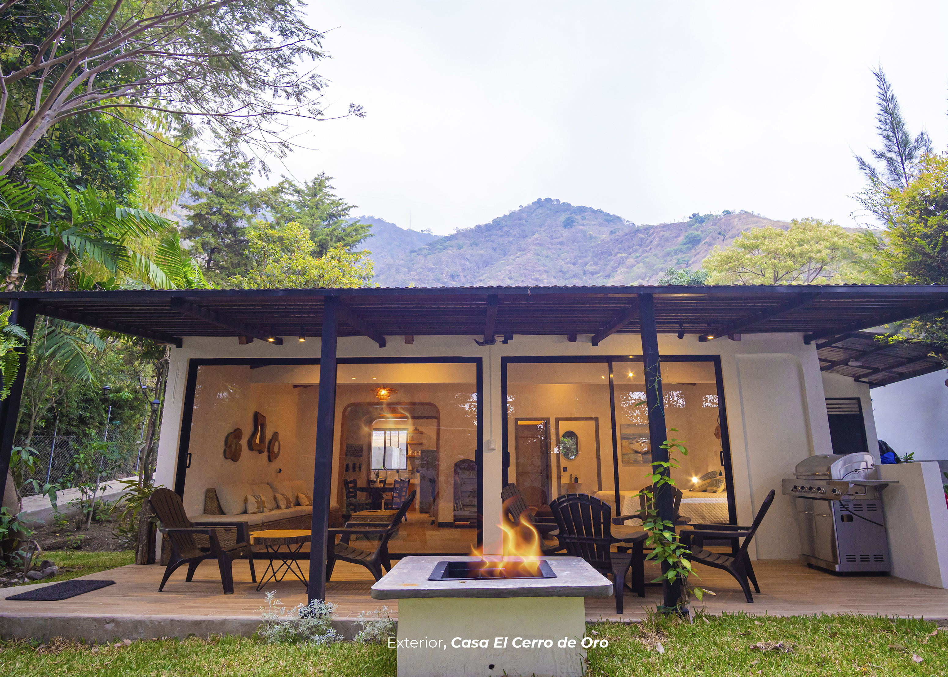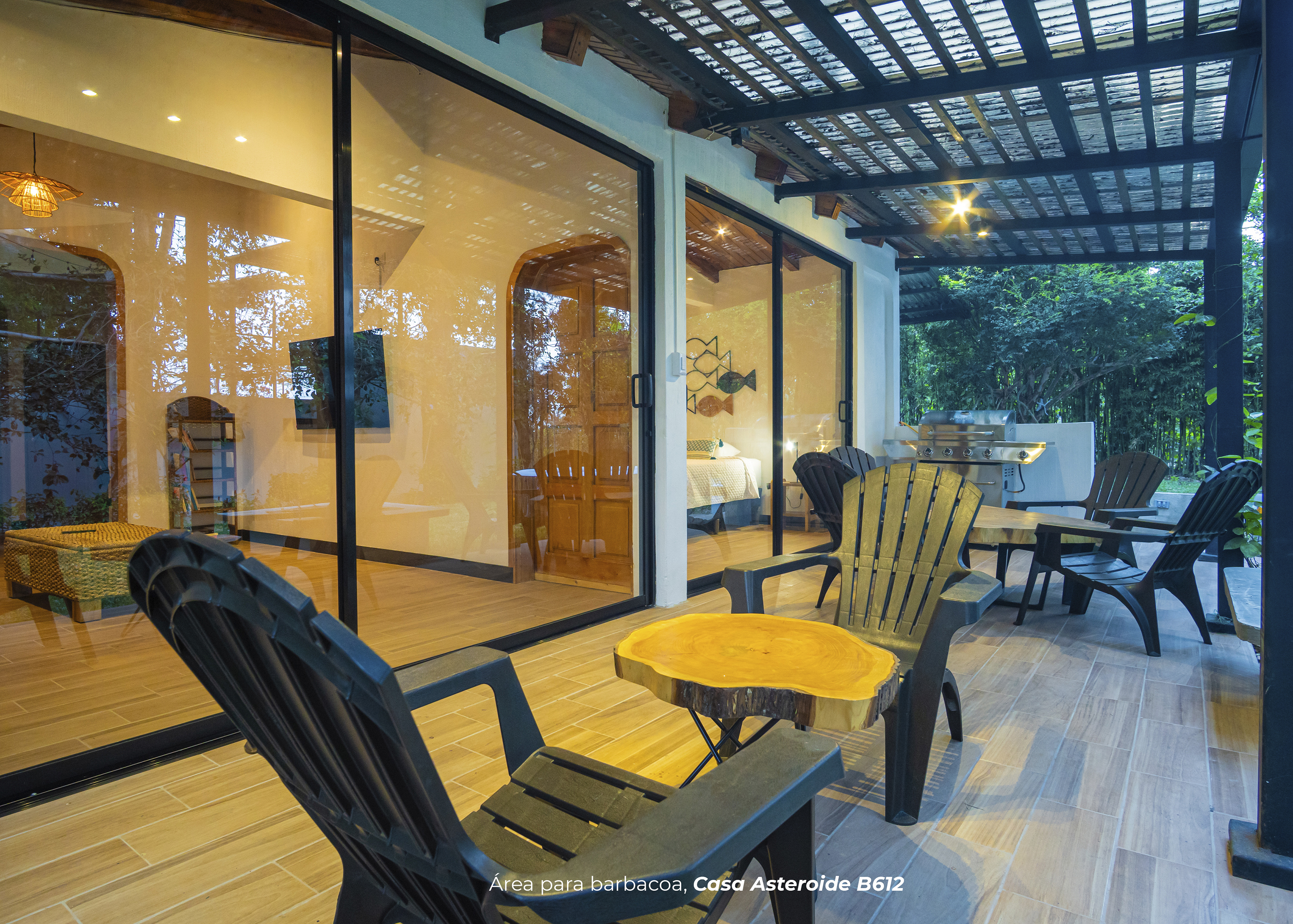 Cuenta con dos habitaciones. Una de ellas con cama king, sofá cama y baño privado. La otra habitación cuenta con 4 camas imperiales y baño. Sala con televisor, comedor, cocina equipada, área para barbacoa y firepit en medio de un hermoso jardín privado.