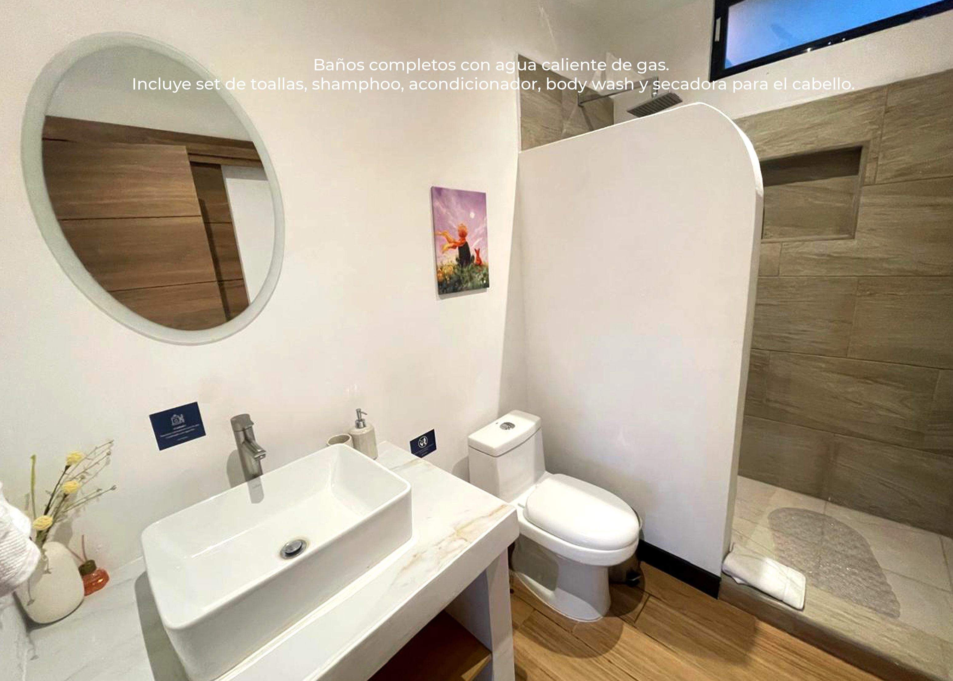 | Body soap, shampoo, acondicionador | Almohadas, sábanas y toallas | Wifi fibra óptica | |
